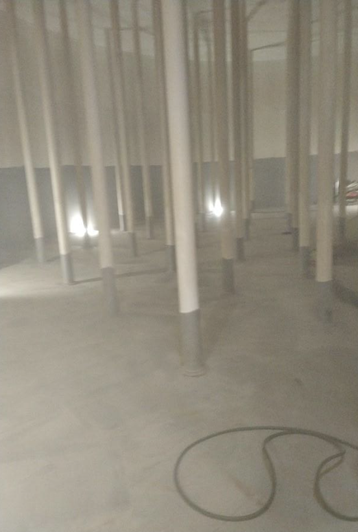 The lower two metres of tank walls, together with floors and support surfaces, were grit blasted to Swedish Standard Sa 2.5, targeting a minimum 75-micron surface profile to support coating adhesion.
