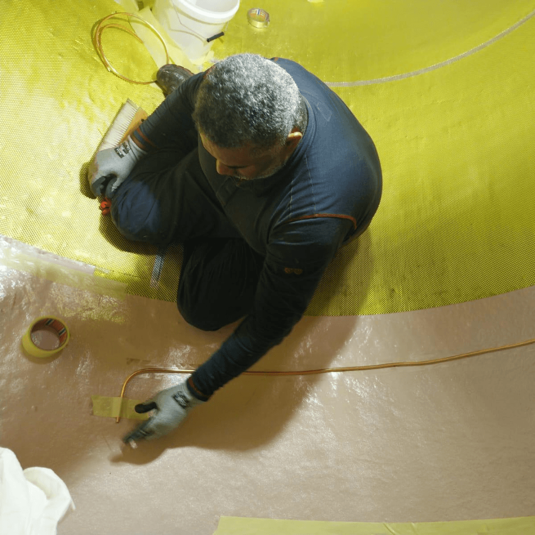 Interstice monitoring lines were installed before knotted aluminium sheets were fixed in place, overlapped and partially laminated with woven fibreglass reinforcement. A second EPOFLEX® layer was then applied and cured, followed by repeated vacuum and pinhole testing. Tightness testing was undertaken before application of a conductive coating. A Class 1 vacuum leak detection system was installed within the interstice in line with EN 13160-2. Following successful testing and commissioning, all lids and pipework were reinstalled and the system was formally handed back to the client.